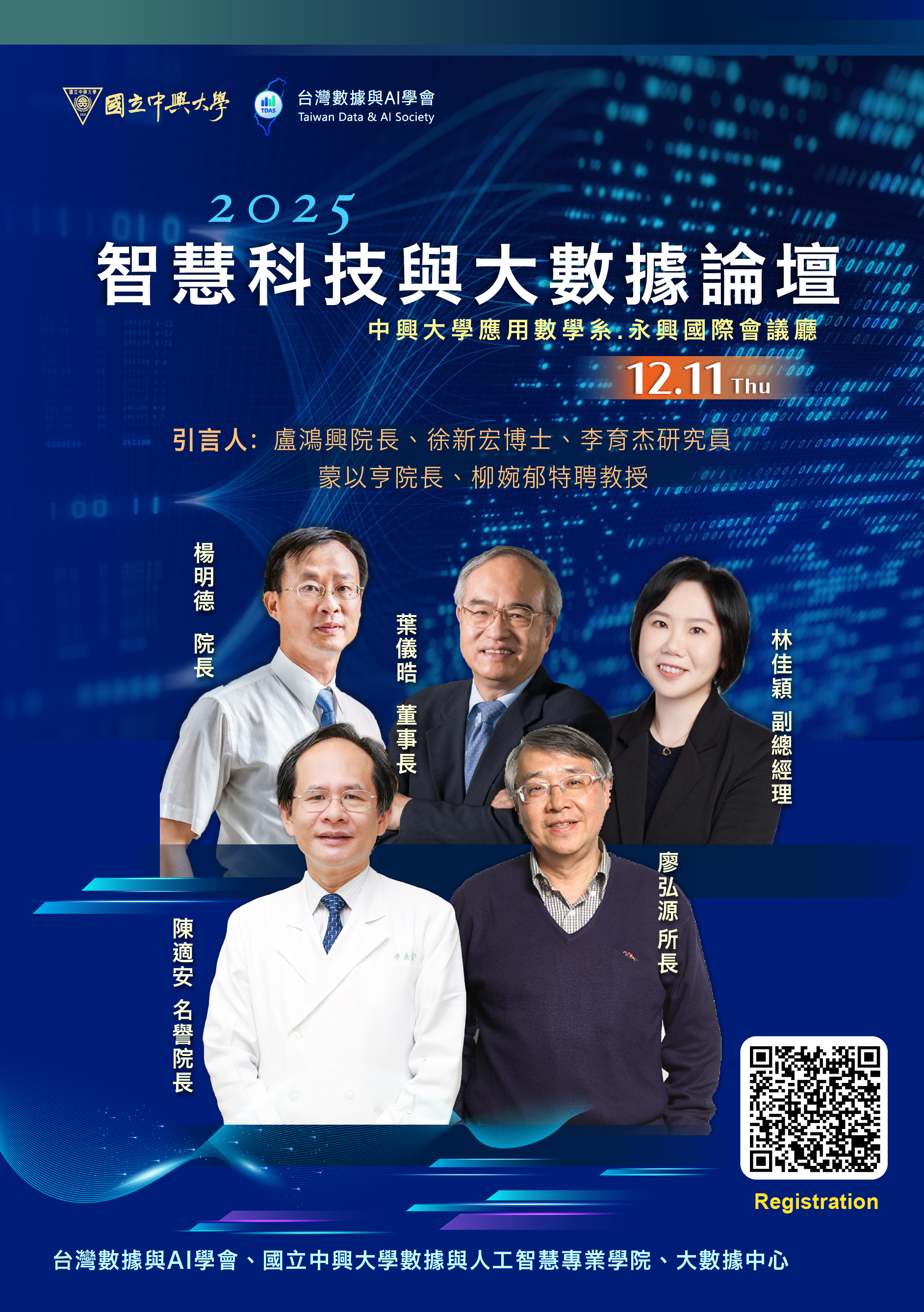 台灣數據與AI學會將於12月11日(四)國立中興大學應用數學系永興國際會議廳辦理2025智慧科技與大數據論壇,我們將邀請學界、業界大師主講,摯地歡迎各界廠商、師生踴躍參與!