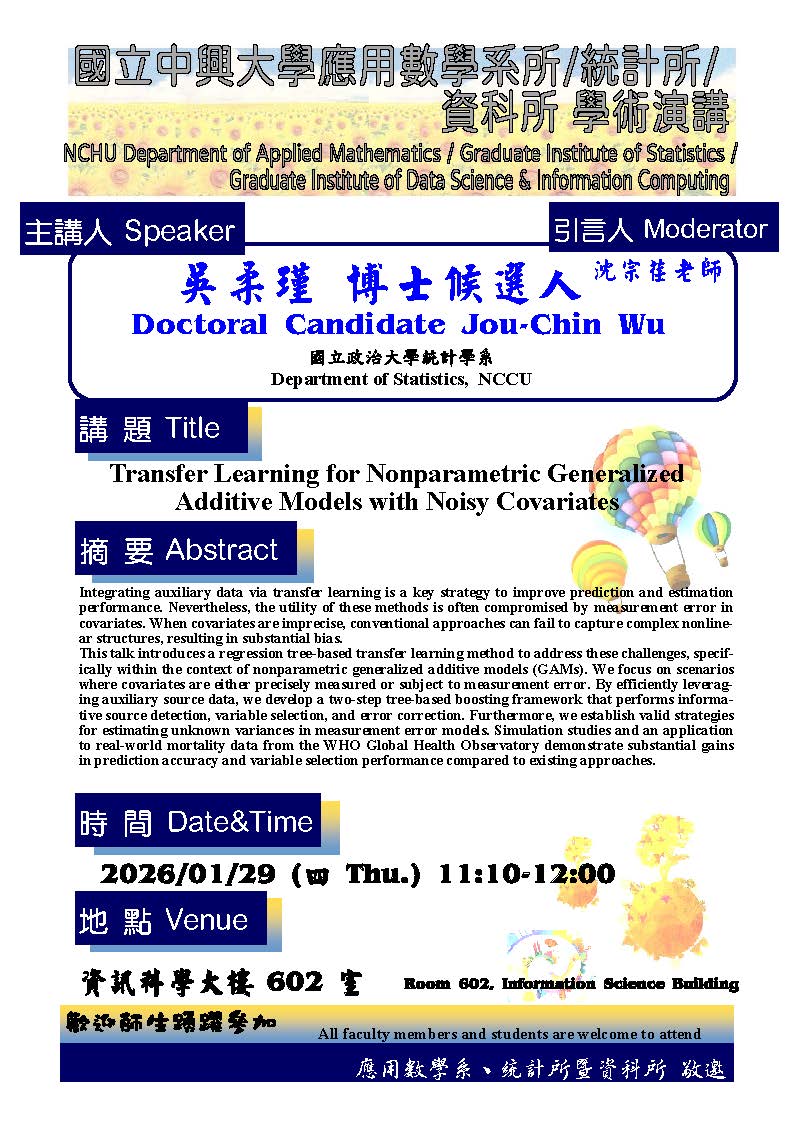 演講者:吳柔瑾 博士候選人 學校名稱/服務單位:國立政治大學統計學系 演講題目:Transfer Learning for Nonparametric Generalized Additive Models with Noisy Covariates 演講時間:2026/01/29(四) 11:10-12:00 演講地點:資訊科學大樓602室 Speaker: Doctoral Candidate Jou-Chin Wu Affiliation: Department of Statistics, NCCU Title: Transfer Learning for Nonparametric Generalized Additive Models with Noisy Covariates Time: January 29, 2026 (Thu.), 11:10–12:00 Venue: Room 602, Information Science Building