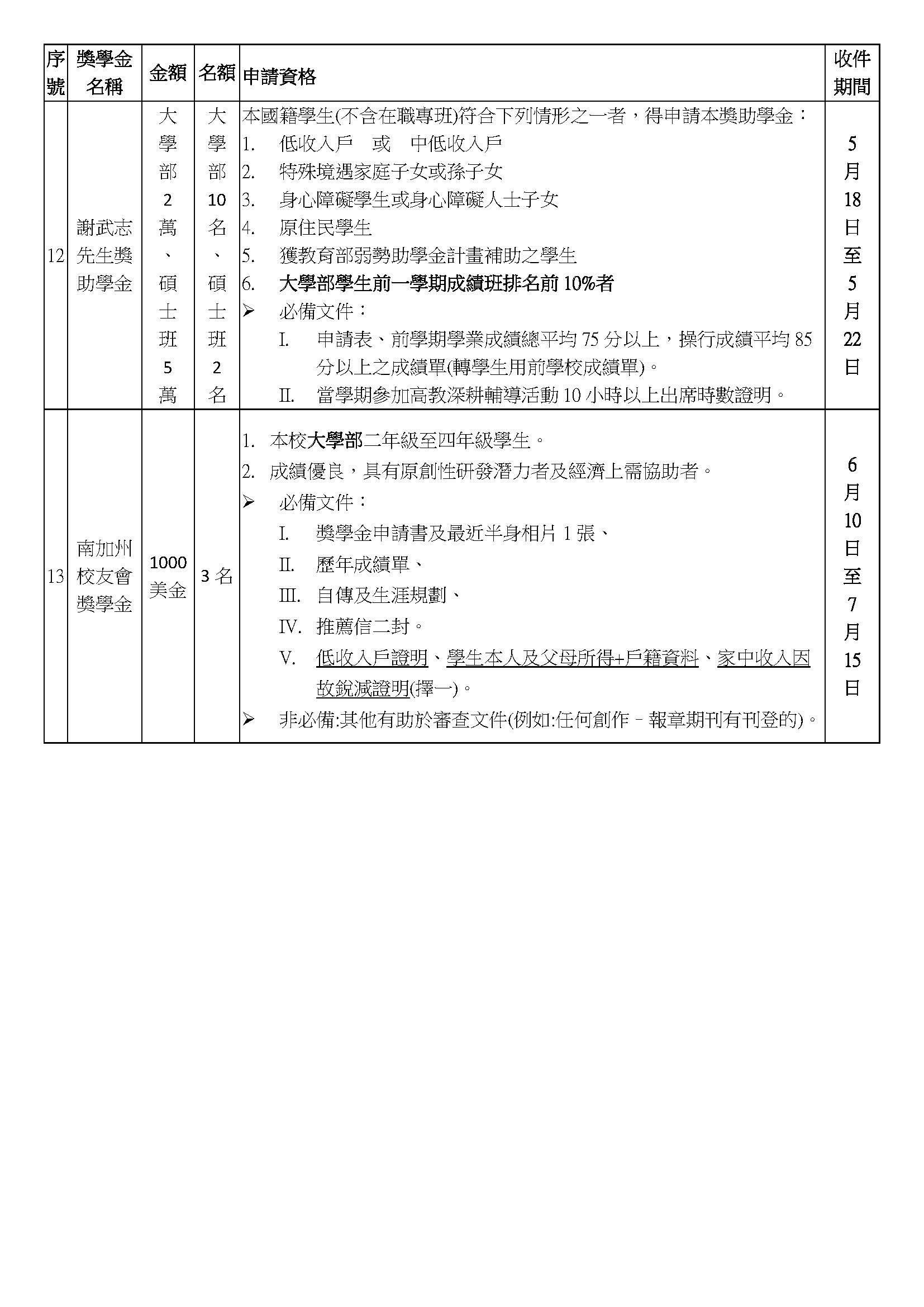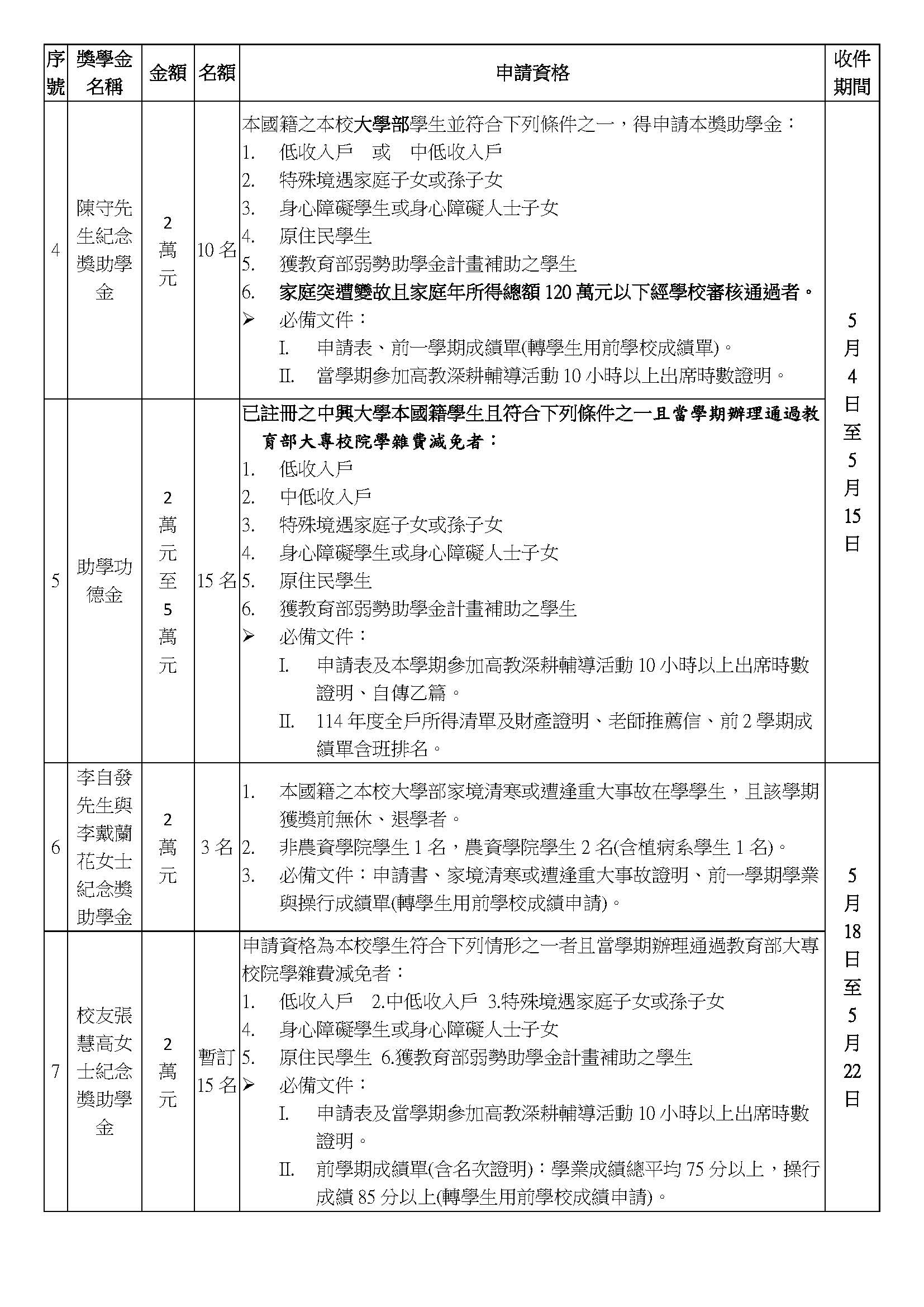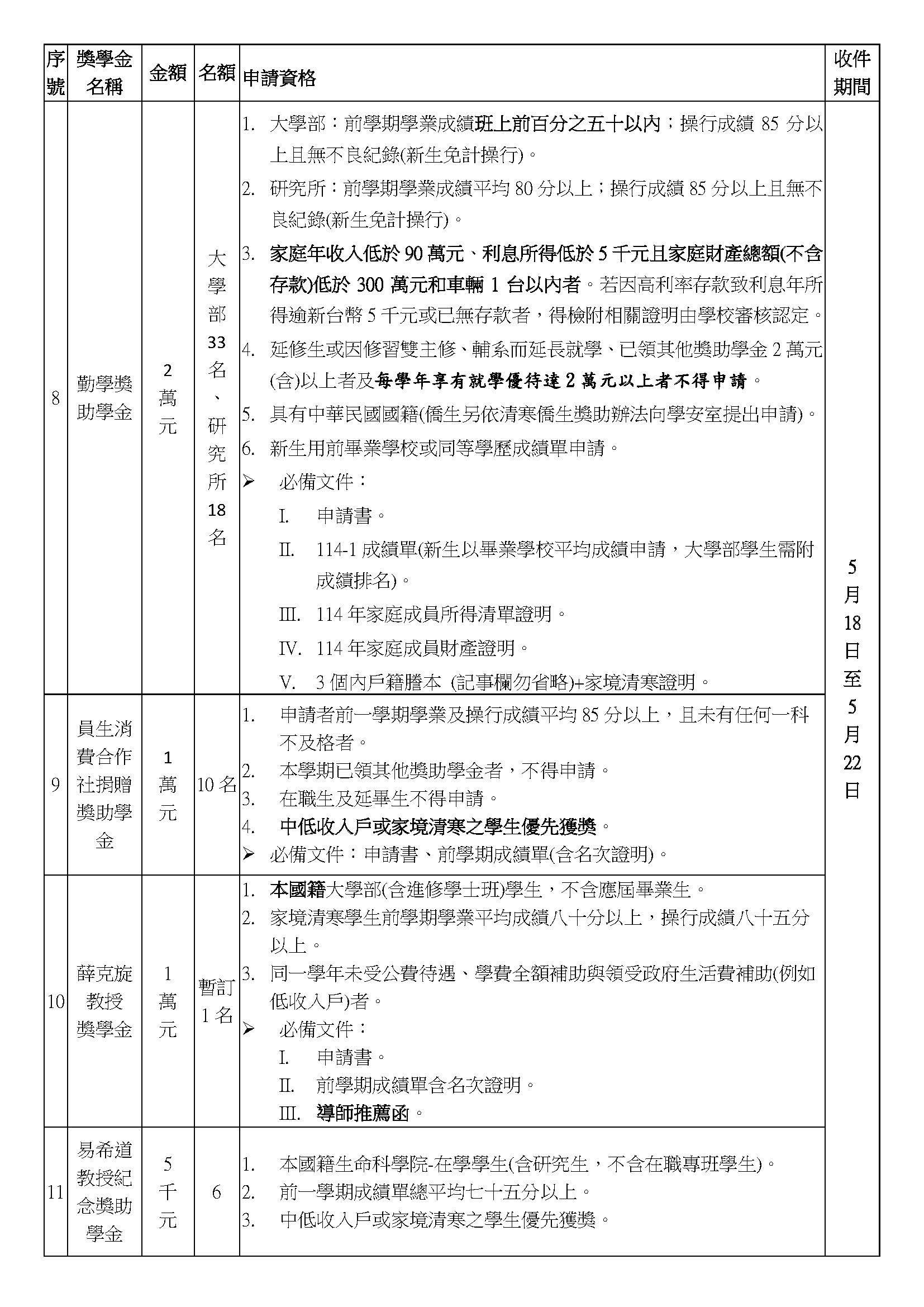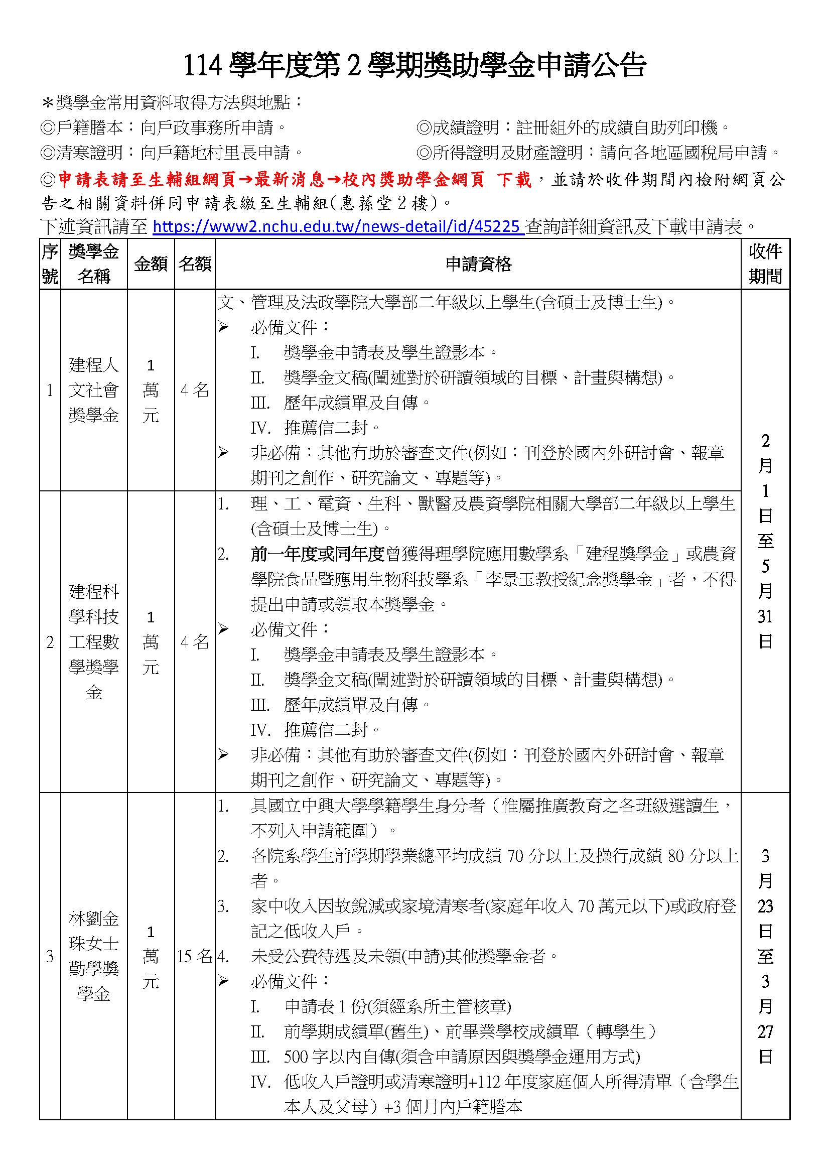 114學年度第2學期校內獎助學金收件日期一覽表請至本校學務處生輔組網頁-最新消息-校內獎助學金查詢 https://www.osa.nchu.edu.tw/osa/laa/#tab1 如有疑問,請電洽04-22840663生輔組曾小姐。