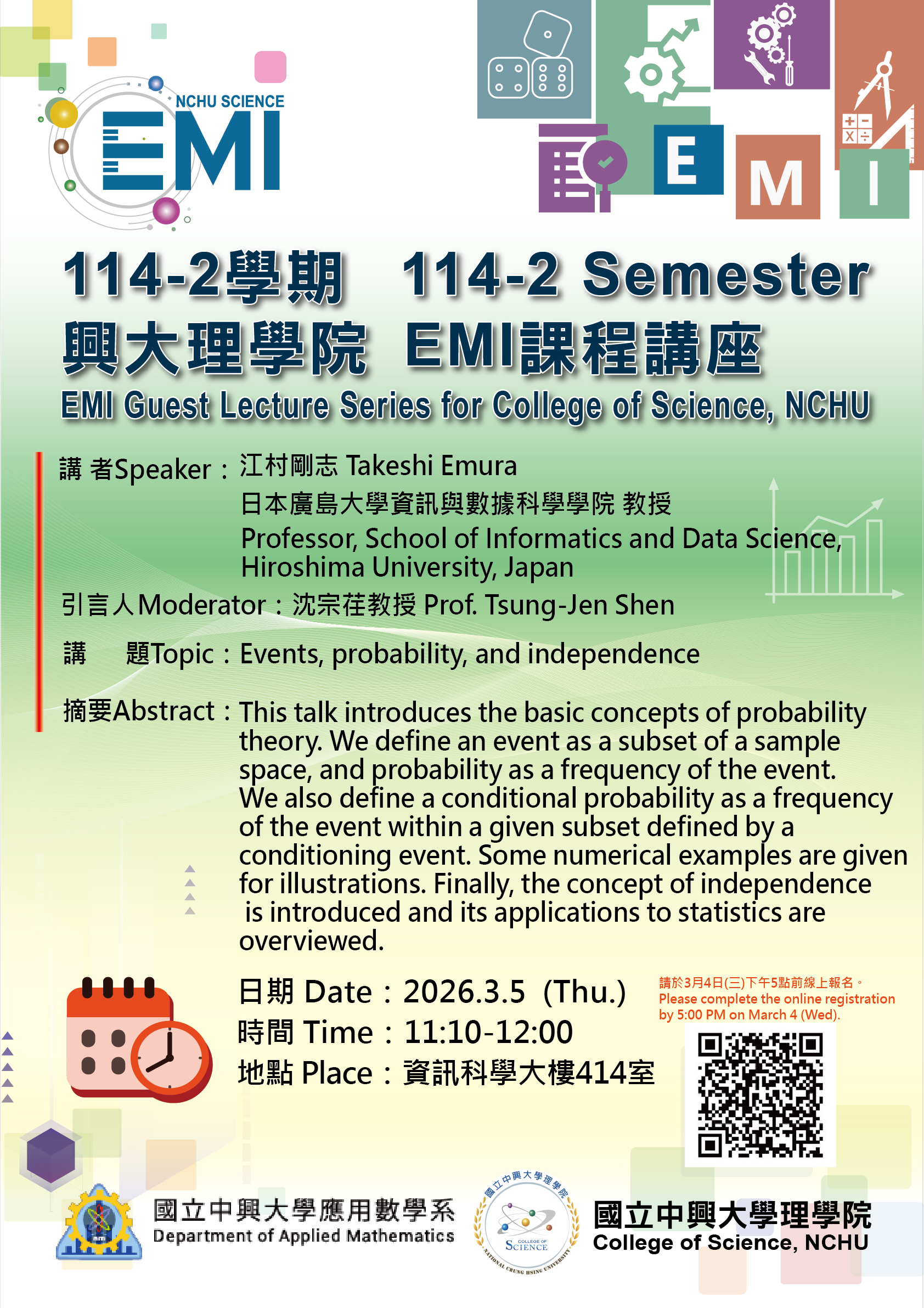 此講座開放給應數系學生報名,請同學踴躍報名參加。 114-2學期 114-2 Semester 興大理學院 EMI課堂講座 EMI Guest Lecture Series for College of Science, NCHU 講者Speaker:江村剛志 Takeshi Emura 日本廣島大學資訊與數據科學學院 教授 Professor, School of Informatics and Data Science, Hiroshima University, Japan 引言人 Moderator:沈宗荏教授 Prof. Tsung-Jen Shen 講題Topic:Events, probability, and independence 摘要Abstract: This talk introduces the basic concepts of probability theory. We define an event as a subset of a sample space, and probability as a frequency of the event. We also define a conditional probability as a frequency of the event within a given subset defined by a conditioning event. Some numerical examples are given for illustrations. Finally, the concept of independence is introduced and its applications to statistics are overviewed. 日期 Date: 2026.3.5 (Thu.) 時間 Time: 11:10-12:00 地點 Place: 資訊科學大樓414室 Room 414, Information Science Building 請於3月4日(三)下午5點前線上報名。 Please complete the online registration by 5:00 PM on March 4 (Wed). https://forms.gle/CtswJ4yFvzhdgBY69